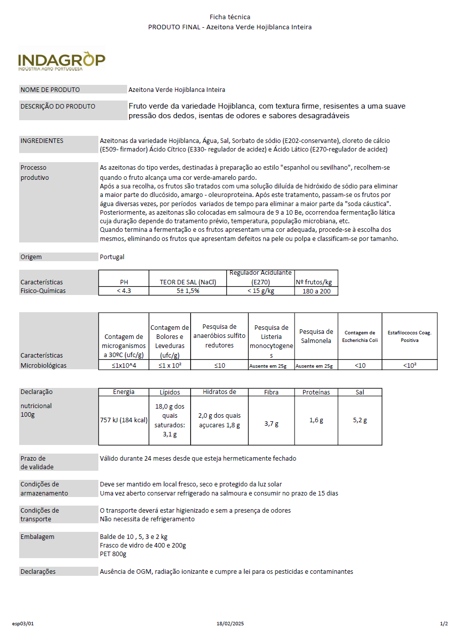 As Azeitonas Verdes Inteiras são frutos cuidadosamente selecionados e colhidos quando atingem o tamanho definitivo, para garantir uma qualidade superior. O seu processo de conservação controlado origina um sabor único. É um fruto muito apreciado devido ao seu sabor frutado e uma textura firme e suave.