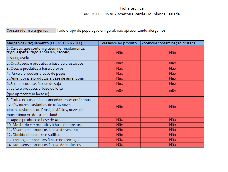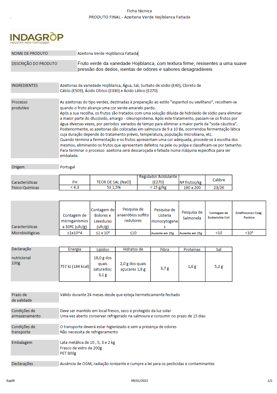 Fruto verde da variedade Hojiblanca, com textura firme, resisentes a uma suave pressão dos dedos, isentas de odores e sabores desagradáveis.
