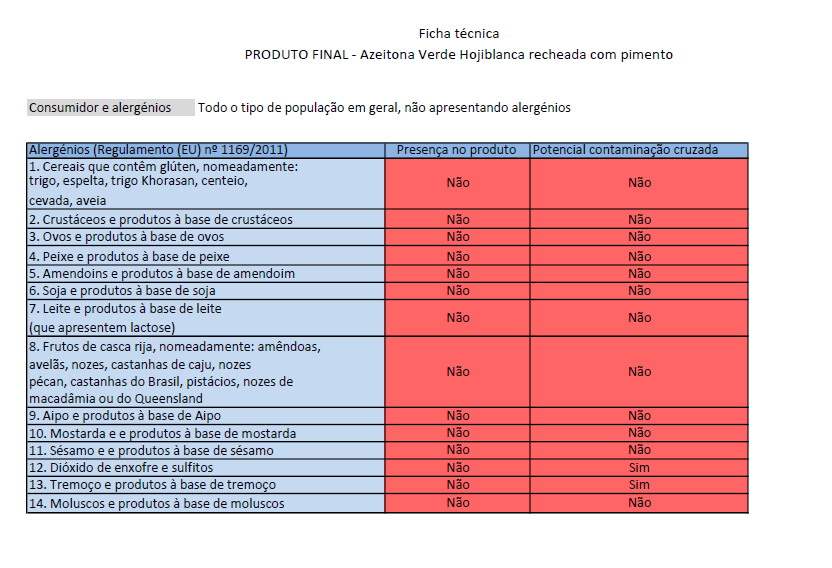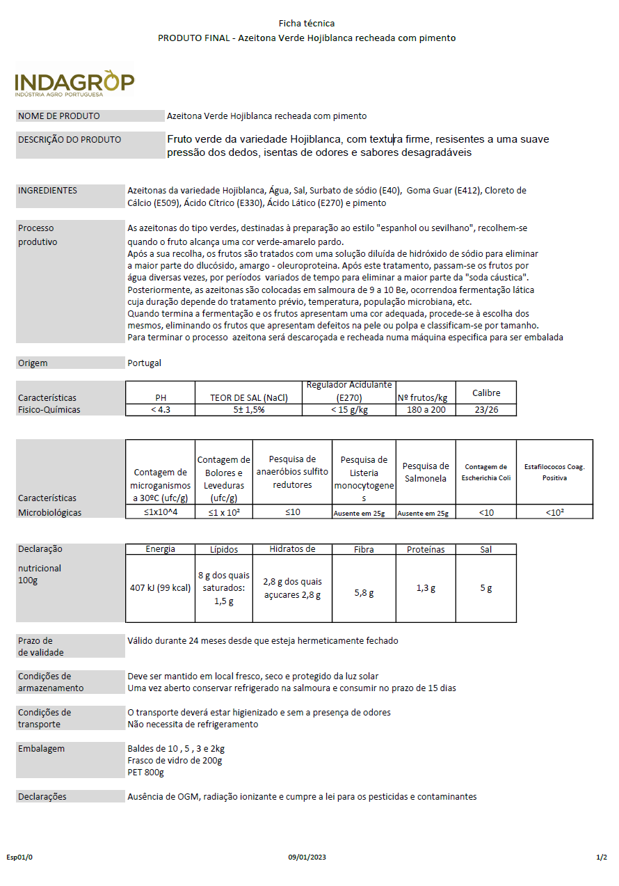 Fruto verde da variedade Hojiblanca, com textura firme, resisentes a uma suave pressão dos dedos, isentas de odores e sabores desagradáveis